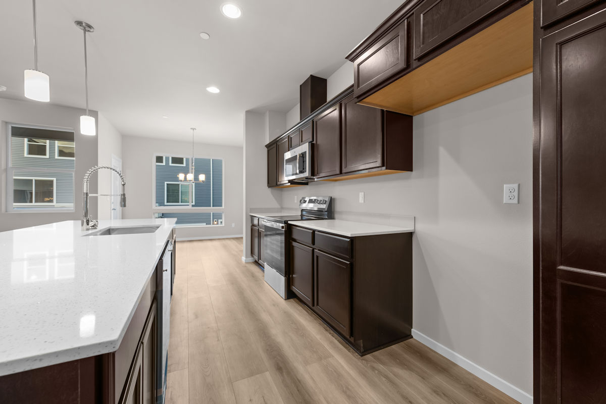 Welcome to the Atlas. This townhome is thoughtfully designed to maximize function and comfort in every space. The lower level includes a private bedroom, perfect for weekend guests or a quiet retreat. A deep garage provides ample room for parking and storage. The main level is ideal for gathering, with the open layout centering around a generous kitchen island and flowing seamlessly to the covered deck. Stainless steel appliances, quartz countertops, and laminate hardwood floors deliver quality and timeless style. A pocket office creates a peaceful spot for focus and productivity. Upstairs, the owner’s suite features a dual-vanity bathroom and generous closet space. With 4 bedrooms and 2.5 bathrooms, this home offers flexible spaces designed to grow with your needs.
