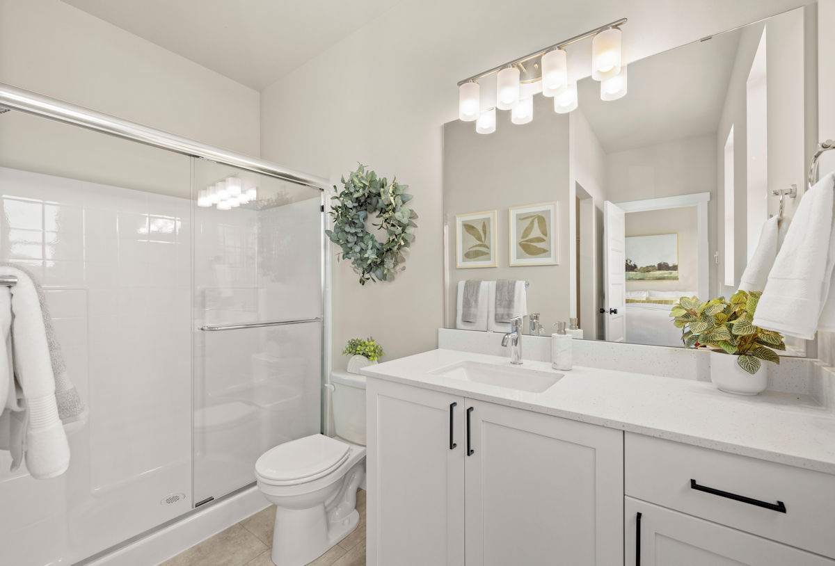 • Quartz slab countertops with matching 4″ quartz backsplash on bathroom vanities