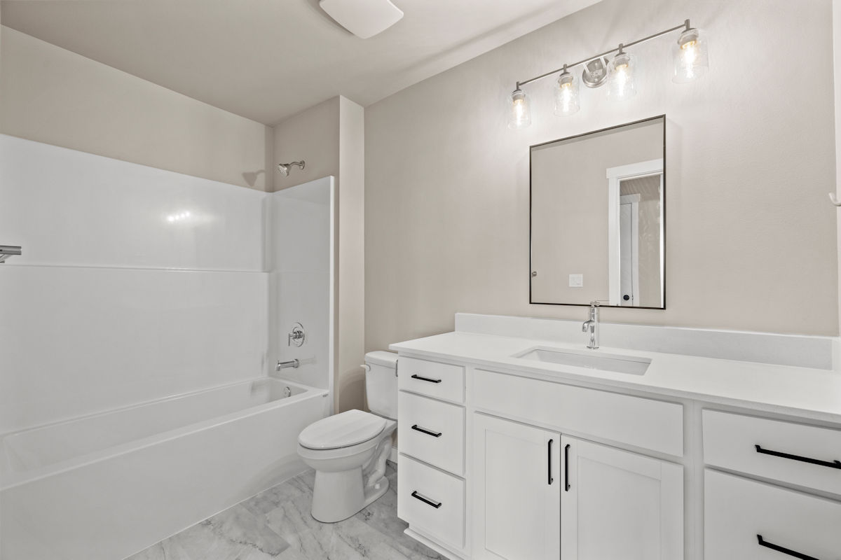 - Quartz slab countertops with matching 4″ backsplash on bathroom vanities