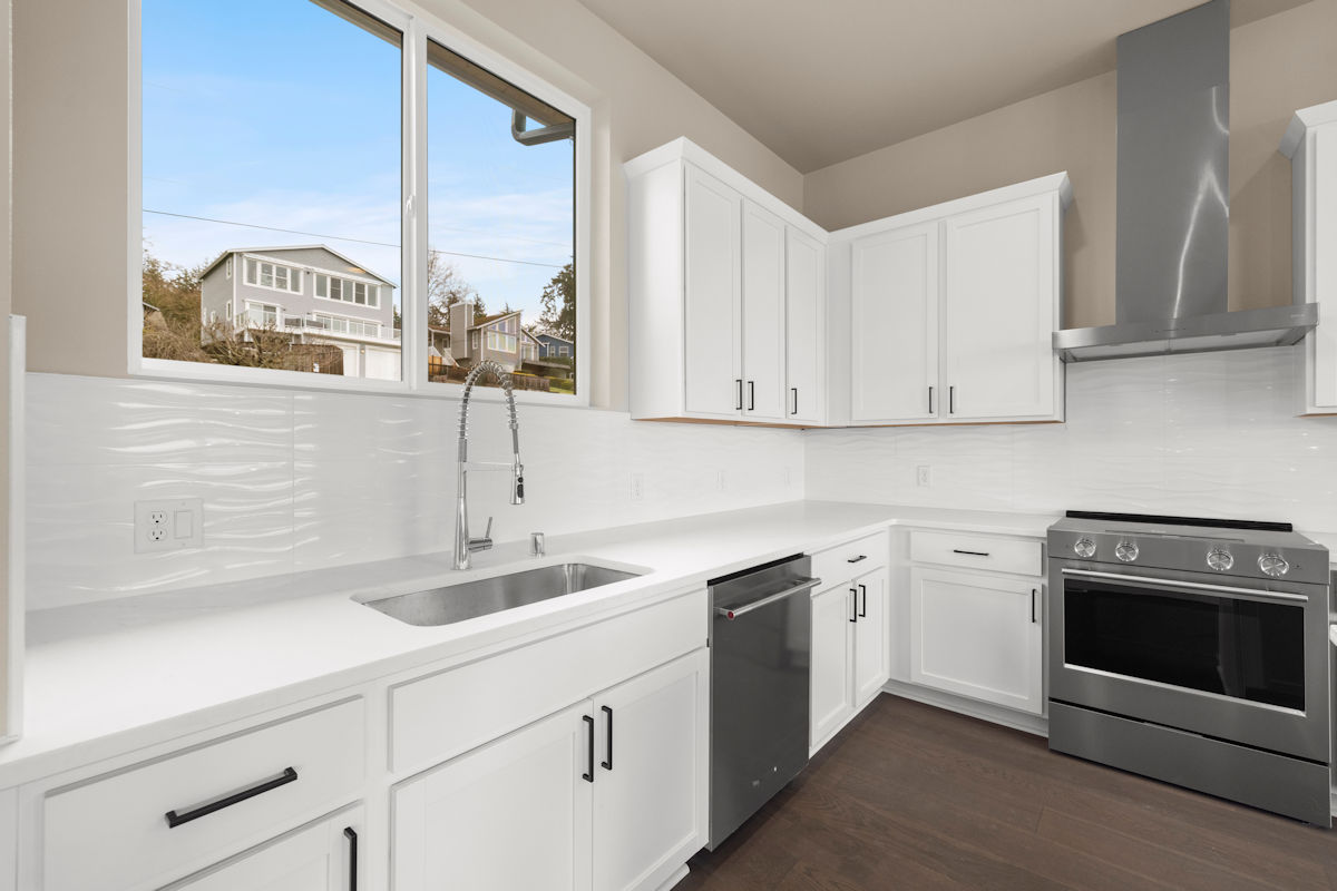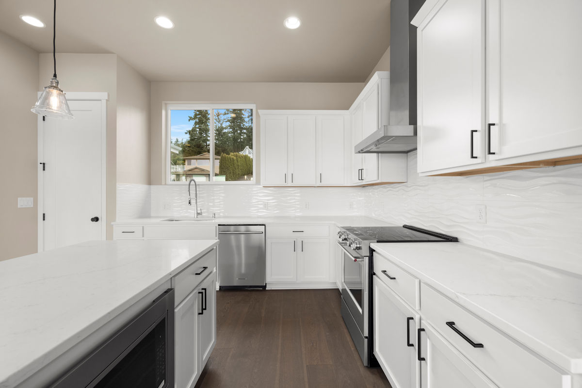 - Quartz slab countertops with modern tile backsplash