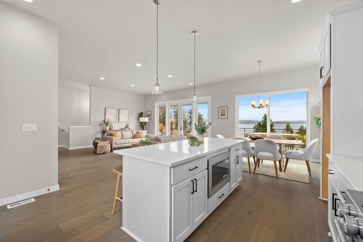 - Gorgeous engineered hardwood flooring at kitchen, dining, great room, & owner’s suite