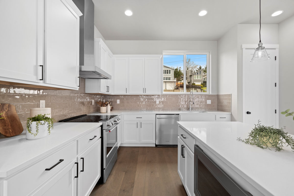 - Quartz slab countertops with matching 4″ backsplash on bathroom vanities